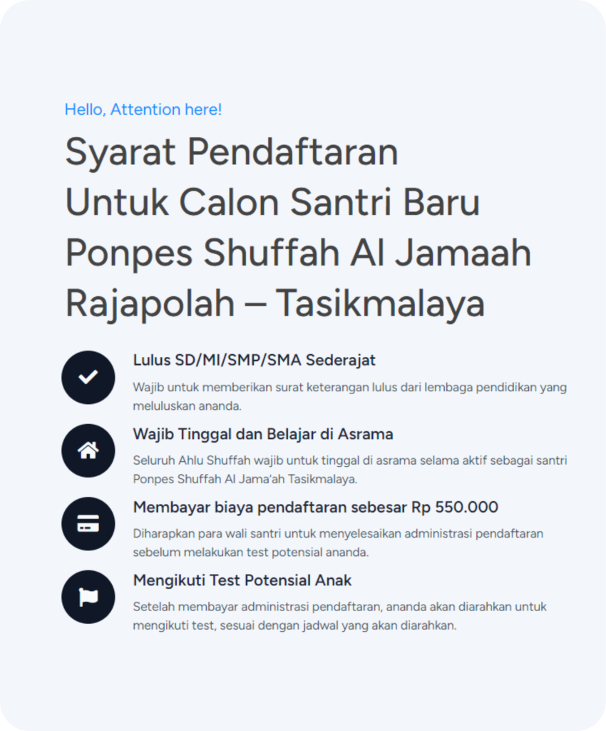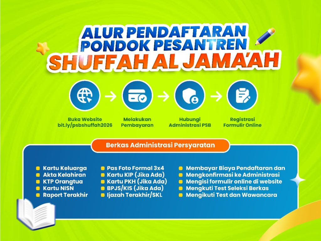 Selamat Datang di Pendaftaran Santri Baru Online Ponpes Shuffah Al Jama’ah, Perhatikan semua informasi mengenai pendaftaran sebelum anda mulai mengisi form pendaftaran.