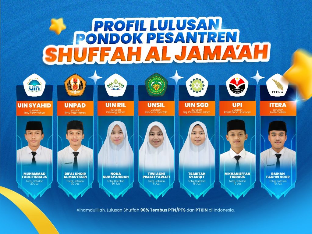 “Alhamdulillah ana adalah salah satu alumni Ponpes Shuffah Al Jama’ah yang berhasil lolos masuk PTN di Tasikmalaya yaitu di Universitas Siliwangi. Ana ucapkan terimakasih kepada pondok tercinta yang telah membantu melewati semua proses masuk PTN. Banyak pengalaman yang ana dapat selama di Shuffah mulai dari menjadi anggota AQSO (As-Shuffah Quranic Student Organization), mengikuti kegiatan yang bermanfaat dan masih banyak lagi. Di sini juga kita di ajarkan untuk menjadi orang kuatt dan disiplin. Pokoknyaa Shuffah Al-Jama’ah THE BEST.”